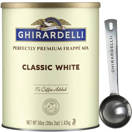 1 lata de mezcla Ghirardelli Classic White Premium Frappé de 3.12 libras 1 cuchara de barista estampada Ghirardelli Base de bebida dulce y aterciopelada para frappés y batidos; Kosher Alternativa prémium a las mezclas de batidos simples y mezclas de frappé; combina bien con espresso, fruta u otros sabores Sin café añadido, este polvo se puede mezclar con infusión fría, jugo, leche de tu elección o simplemente agua