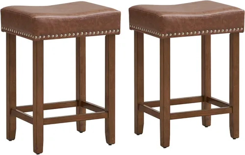 Diseño elegante: nuestros taburetes de bar combinan encanto vintage y natural. El cuero sintético se ve muy texturizado, mientras que los remaches decorativos hacen que los taburetes se vean elegantes. No hay duda de que tales muebles de calidad pueden ser una excelente manera de mostrar su gusto personal. Máxima comodidad: nuestras sillas de bar están diseñadas para mayor comodidad. El asiento ergonómico en forma de silla de montar y los reposapiés adicionales te permiten decir adiós a los asientos incómodos. Además, la piel sintética agradable al tacto y la esponja suave garantizan durabilidad y comodidad. [Marco de madera de caucho macizo]: nuestros taburetes están construidos para durar con marcos de madera de caucho macizo. Las conexiones fuertes aseguran que los taburetes sean estructuralmente estables y no se tambaleen. Cada taburete de bar tiene una capacidad de peso de hasta 250 libras. [Montaje rápido y fácil limpieza]: con nuestras instrucciones fáciles de seguir y el conjunto completo de accesorios, el montaje es muy fácil. Además, el cuero sintético impermeable es suave, lo que te permite limpiarlo y mantenerlo con facilidad. [Ideal para varias ocasiones]: nuestros taburetes de sillín son versátiles. Ya sea un comedor, isla de cocina, bar, restaurante o cafetería, estos taburetes encajarán perfectamente con cualquier entorno. Su diseño elegante y moderno complementa una variedad de estilos interiores.