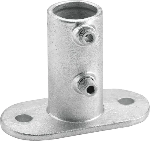 Fabricado de hierro galvanizado para proporcionar la máxima resistencia a la corrosión y larga durabilidad. La instalación de tuberías de brida de riel se usa comúnmente para montar barandillas, rieles de protección u otras estructuras basadas en tuberías en el piso. La brida de riel incluye dos tornillos de fijación endurecidos en el zócalo vertical para una mayor estabilidad de carga lateral. Para una instalación segura, los orificios de fijación de brida deben estar en línea con la carga aplicada., Lote de 1