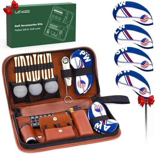 CUBIERTAS ESPECIALES DE CABEZA DE GOLF CLUB: Nuestro juego de golf para hombre se centra en la calidad interior y la belleza exterior. Exquisitas fundas personalizadas no solo protegen tus palos, sino que también muestran tu estética y estilo. Ya sea que estés en el campo o en la vida diaria, llevar nuestra bolsa de equipo de golf puede mostrar tu encanto único, perfecto para profesionales o principiantes OFERTA EL MEJOR VALOR: Este paquete de accesorios de golf para hombres ayuda a los golfistas a mantenerse organizados con herramientas y accesorios esenciales. Con un juego de tee de golf para salir, un telémetro de golf para estimación de distancia, un cepillo grande para palos de limpieza y una herramienta multifuncional 7 en 1 con marcador de bola para reparar greens que reflejen tu etiqueta y más. Estas herramientas cubren todos los aspectos del juego de golf, por lo que es fácil de jugar y anotar en el campo Bolsa de golf duradera e impermeable: nuestra bolsa de suministros de golf está hecha de cuero marrón premium en la superficie y materiales resistentes como nailon o poliéster en el interior para garantizar que pueda soportar condiciones al aire libre y manejo frecuente, tamaño compacto y múltiples compartimentos para una organización eficiente, lo que le permite transportar y cambiar fácilmente sus accesorios en cualquier momento Regalos geniales para golfistas: nuestro kit de regalos de golf personalizado es amado por golfistas masculinos y femeninos, puedes dárselos a tu padre, abuelo, hijo, novio, etc. en cumpleaños, aniversarios, Navidad, Año Nuevo, Día del Padre, etc. También puedes dárselos a tu esposa, novia, hija para mostrar tu apoyo y cuidarlos en el golf LIFXIZE Kit de accesorios de golf: LIFXIZE se centra en deportes al aire libre, nuestro kit de accesorios de golf te da acceso rápido a artículos de uso frecuente en una ronda de golf, llévalos contigo para satisfacer las necesidades básicas de jugar al golf. Lo que obtienes: 1 funda de bolsa de alta calidad (12 x 7 x 2.5 pulgadas), 3 pelotas de golf, 1 buscador de rango, 12 camisetas de golf de madera, 1 cepillo grande, 1 herramientas multifuncionales de golf divot, 1 marcador, 1 soporte para pelotas de golf, 1 clip de pelota de golf