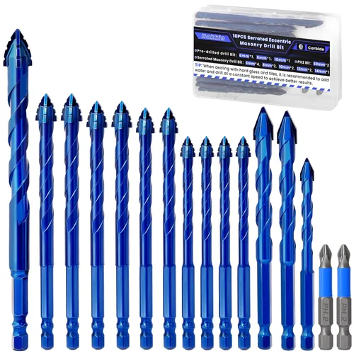 Azulejo+hormigón+tornillo: un juego para completar su trabajo - Este paquete de 16 incluye tamaños: 1/4 "(6 mm), 5/16 "(8 mm), 3/8 "(10 mm), 1/2 "(12 mm), 9/16 "(14 mm), 2 piezas PH2 puntas de destornillador (1.969 in); Este juego es versátil, atendiendo a diversos requisitos de perforación como trabajar con vidrio, azulejos y cerámica. ics Construcción de alta calidad: la broca de hormigón Hakkin está hecha de alto cobalto, que es más avanzado que YG6X, lo que aumenta la resistencia al desgaste y una vida útil extra más larga, por lo que las brocas duran múltiples usos Amplios escenarios aplicables: adecuado para vidrio, cerámica, azulejos, espejos, macetas, madera, porcelana, paredes de ladrillo, mármol y otros materiales. Perfecto para proyectos de bricolaje, renovaciones del hogar, trabajos de construcción o trabajos de contratación profesional que involucran superficies de mampostería Mango hexagonal universal: el juego de brocas excéntricas para mampostería Hakkin está equipado con mangos hexagonales de 1/4 de pulgada, adaptados a una variedad de herramientas eléctricas, fáciles de operar, fáciles de reemplazar, mejoran la eficiencia de tu trabajo, sumérgete en el proyecto de bricolaje Consejos de uso para el juego de brocas Hakkin - Utiliza baja velocidad con presión estable hacia abajo para mejorar la eficiencia de corte y reducir el desgaste de la broca de aleación. Para aleaciones de alta dureza, se recomienda el enfriamiento intermitente por agua durante el funcionamiento a alta temperatura para extender eficazmente la vida útil de la broca