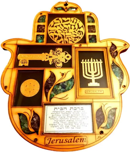 Decoración de pared Hamsa. con Shema Israel Mano de Hamsa para suerte y protección. Las piedras son turquesa, amatista, coralino, Qwartz Buena suerte Hamsa. Mano de Fátima