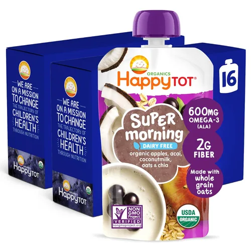 Las mezclas de desayuno sin lácteos Happy tot Super Morning están hechas con leche de coco, y cuentan con avena orgánica y sabores brillantes como fruta de acai y dragón. Cada bolsa tiene 600 mg de Omega-3s (ALA) de chia y 0.07 oz de fibra, un súper comienzo para el día de tu bebé