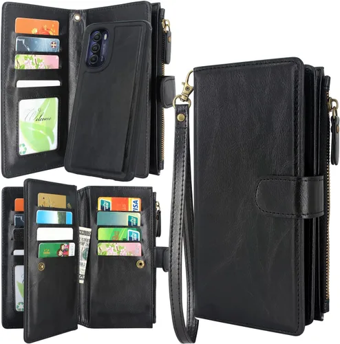 Harryshell Funda de piel con cremallera magnética desmontable y bolsillo para monedas, 12 ranuras para tarjetas, correa de muñeca compatible