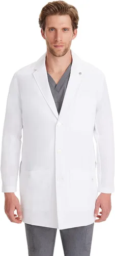 Healing Hands Logan - Abrigo de laboratorio blanco para hombre con 5 bolsillos, detalles de punto y aberturas laterales, longitud de espalda 34