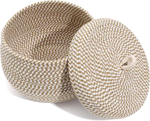 Algodón cuerda 1. Almacenamiento eficiente: mantén tu hogar organizado con esta cesta redonda con tapa, ideal para guardar juguetes, llaves, artículos de tocador o artículos esenciales de cocina como huevos y especias, asegurando un espacio 2. Elegante decoración del hogar: añade textura y encanto a cualquier habitación con esta cesta decorativa, que se mezcla perfectamente con la decoración de tu hogar existente mientras proporciona un almacenamiento práctico 3. Material de cuerda de algodón resistente: hecha de gran cuerda de algodón, esta pequeña cesta tejida con tapa ligera pero resistente está diseñada para soportar el uso diario, con una tapa con un anillo de tracción para un fácil manejo 4. Uso versátil: ideal para varios ajustes, esta pequeña cesta de almacenamiento se puede colocar en mesas de entrada, encimeras de cocina, estanterías o mesitas de noche, por lo que es una adición versátil a tu hogar 5. Diseño compacto y práctico: cestas de estante con asa de 8.26 x 8.26 x 6.69 pulgadas, esta canasta ofrece un amplio almacenamiento sin ocupar mucho espacio, por lo que es imprescindible para vivir