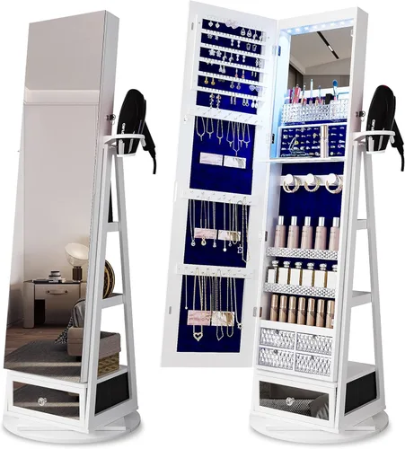 Ver Estantes de Joyería Ir al inicio mIAHNEBC Armario giratorio de 360 con espejo, organizador de joyas de pie con luces LED, espejo de longitud completa con almacenamiento de joyas, cajas