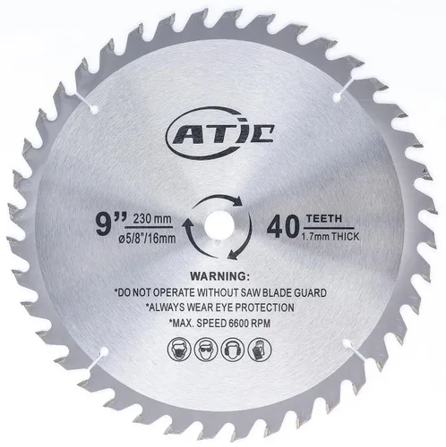 Cuchilla de combinación de usos múltiples, rasgado y corte transversal en madera blanda/dura, madera contrachapada. Bueno en laminado Max RPM: 8000; corte: 0.1"; espesor de la placa: 0.063"; ángulo de gancho: 10-15 grados; diseño de dientes: ATB Punta de carburo de tungsteno de alta calidad que proporciona la mejor precisión, durabilidad y rendimiento Diseño antiretroceso/vibración, ranuras de expansión. Corte fino para un corte rápido y suave Diámetro: 9" (230mm); Tamaño del eje: 5/8" (16MM); Grosor del cuerpo: 1.77MM; Dientes: 40T