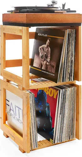 Materiales duraderos: Hecho de bambú, microfibra, vinilo, madera y cajas de madera para mayor durabilidad y longevidad. Almacenamiento conveniente: viene con 2 soportes para discos de vinilo para almacenar 75 LPs y cajas para un fácil acceso. Diseño multiusos: se puede utilizar como soporte para tocadiscos con estante de almacenamiento incorporado para discos de vinilo. Fácil montaje: todas las herramientas e instrucciones necesarias incluidas para un montaje rápido y sencillo. Tamaño compacto: mide solo 16.5 x 15 x 14 pulgadas, perfecto para espacios pequeños.