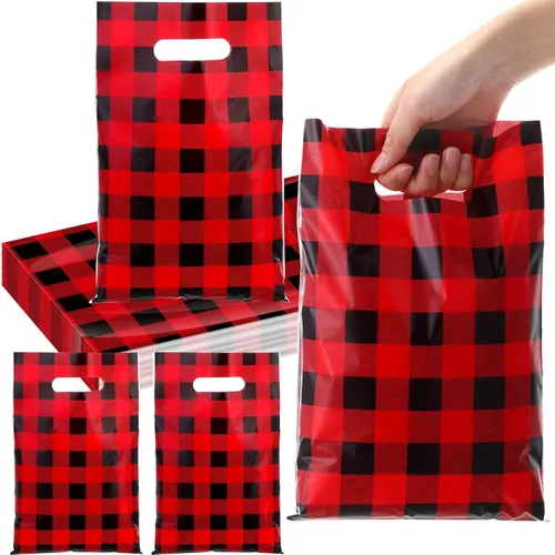 Honoson 100 Piezas Bolsas de Regalo de Plástico para Navidad a Granel Mercancía Navideña Bolsas de Dulces y Golosinas a Cuadros Buffalo con Asa 8" x