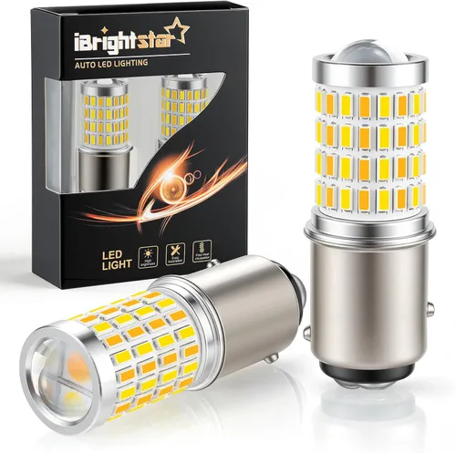 (juego de 2 bombillas) chips de alto brillo 72SMD 3014 y 4SMD 3030 por bombilla, voltaje de funcionamiento: 9v-30v Compatible con: 1157 BAY15D P21/5W 1016 1034 1157 1157A 2057 2057A 2357 2357A 2357NA 2397 3496 7528, etc. Fácil instalación, plug and play. Aplicación: Encienda amarillo dorado para luces de estacionamiento o luces de circulación diurna, ilumina ámbar para luces intermitentes. La señal de giro parpadea "ámbar-apagado" en lugar de "ámbar-blanco-ámbar-blanco", lo que hace que sea más fácil de ver (la mayoría de las bombillas de conmutación en el mercado parpadean ámbar-blanco-ámbar-blanco). Ventaja: Más de un 300% más brillante que la bombilla halógena original, carcasa de aluminio completa con lente de proyección para una salida de luz máxima y una mejor distribución del calor, IC de corriente constante incorporado para una vida útil más larga y bajo consumo de energía. AVISO: Es posible que se necesite la resistencia de carga de 50w 6ohm o el relé intermitente para evitar el hiperflash, el mal funcionamiento o el mensaje de advertencia de disparo en el tablero. Cualquier otro problema, no dude en contactarnos, siempre estamos aquí para satisfacerle.