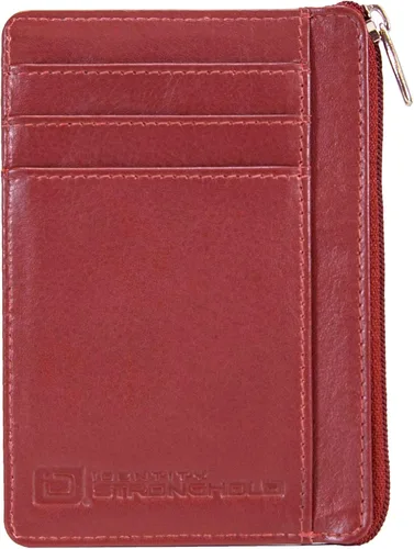 ID STRONGHOLD - Cartera con bolsillo frontal RFID, mini, minimalista, delgada, de piel auténtica con cremallera, Rojo