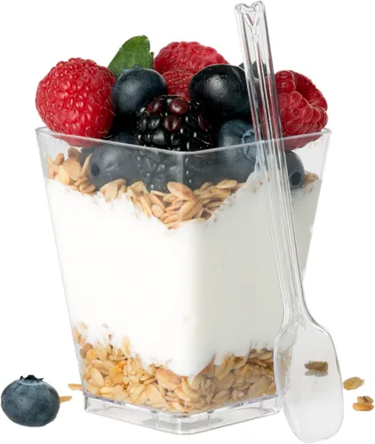 Mejora cualquier ocasión: con estas elegantes y premium tazas de postres Estas tazas cuadradas de plástico de 5 onzas vienen con 20 cucharas, todo lo que necesitas para servir a 20 invitados. Estas pequeñas tazas del desierto son perfectas para el desayuno, el brunch, los aperitivos y mucho más Duradero y elegante: los vasos de chupito de plástico duro transparente y de alta calidad de Ilyapa de 5 onzas tienen una sensación sólida y de calidad y resisten las necesidades de tu fiesta o reunión. La mejor parte es que, una vez que termine tu evento, ¡no hay platos que hacer! Simplemente lávalas y reutilizas, o deséchalas Elegante y rentable: estas tazas de plástico transparente de 5 onzas para postre son productos duraderos y de calidad que cubren las necesidades de tu evento para servir a la gente a un costo bajo y económico. Perfecto para fiestas de Navidad, celebraciones de vacaciones, banquetes, bodas, fiestas de cumpleaños, reuniones de empresa y otros eventos de catering. Reciclables o reutilizables: desecha estas tazas cuadradas de 5 onzas 100% reciclables sin preocupaciones después de tu fiesta, o simplemente lávalas y apilas para eventos posteriores. Satisfacción garantizada: ILYAPA respalda todos sus productos al 100%. Utilizamos un embalaje resistente y duradero para garantizar que tus mini tazas de postre de plástico lleguen en las mejores condiciones posibles.