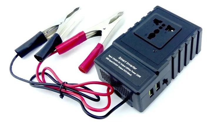 Inversor de voltaje con controlador integrado y 2 puertos USB de 3100 mAh de 12 o 24 volt 220 W para auto. Incluye pinzas para conexión directa a batería. Ideal para cargar dispositivos y alimentar equipos pequeños durante viajes o emergencias. Compacto y fácil de usar. Producto en caja.