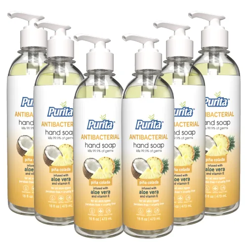Nuestro jabón de manos está mejorado con aloe vera y vitamina E que mata microbios y bacterias en la piel. Mantiene tus manos suaves e hidratadas incluso después de muchos usos y hace que tus manos se sientan suaves y frescas. El jabón líquido para manos Purita contiene el aroma de piña colada. Está impregnado de un aroma suave pero refrescante que vigoriza tu piel sin dominar tus sentidos. El jabón es libre de parabenos y ftalatos, conservantes y libre de ingredientes agresivos, por lo que no se seca ni irrita la piel y es adecuado para uso frecuente. Fácil de usar: ayuda a mantener a tu familia y a aquellos que cuidas sanos con el jabón de manos PURITA Perfecto para tu oficina, hogar, cocina o baño. Nuestro jabón de manos ofrece la máxima protección contra los microbios que causan enfermedades, el jabón de manos requiere agua para enjuagarlo. Útil para profesores, vendedores, trabajo comunitario y otros trabajos que necesitan contactar con el público.