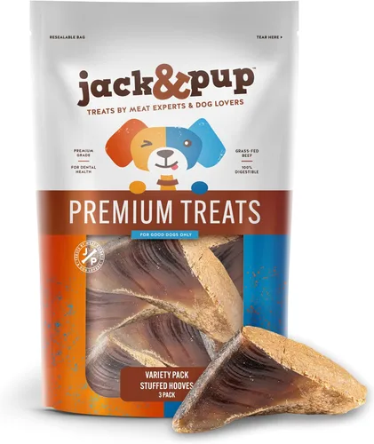 ¿QUÉ CONTIENE?- Las pezuñas de vaca rellenas Jack & Pup para perros incluyen 3 pezuñas de vaca rellenas en los siguientes sabores: tocino y queso, mantequilla de cacahuete y bully stick. Estas pezuñas de vaca deliciosamente rellenas para perros son la alternativa perfecta a los huesos de médula para perros. Masticable de larga duración: nuestros huesos de perro rellenos de larga duración satisfarán a cachorros de dentición, masticadores agresivos y perros grandes por igual. Los deliciosos rellenos de estas pezuñas de vaca rellenas para perros los mantendrán ocupados y estimulados durante horas. Solo lo mejor para tu cachorro: al igual que con todos nuestros productos, nuestros huesos de perro rellenos se obtienen de ganado alimentado con pasto, de corral libre y criados sin hormonas ni antibióticos añadidos. Estos huesos rellenos para perros son el mejor premio hecho de pezuñas de vaca para mantener a tu perro ocupado y saludable APOYA LA SALUD DE LOS DIENTES, ENCÍAS Y MANDÍBULAS - Cada pezuña de vaca ayuda a mantener los dientes de tu perro saludables y limpios al eliminar eficazmente la acumulación de sarro y la placa, y fortalecer las encías y las mandíbulas. Estos huesos rellenos para perros son el hueso relleno perfecto para perros de todos los tamaños. DIGESTIBLE Y SEGURO: estos huesos de perro de peluche son totalmente deliciosos y digeribles. Las pezuñas de vaca son ricas en proteínas y suaves para el sistema digestivo de tu cachorro.