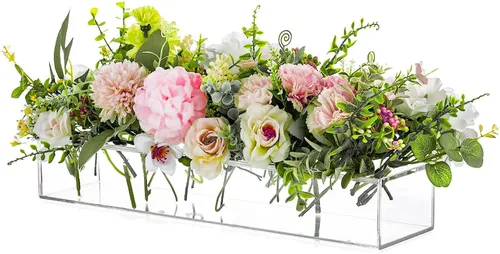 Elegante y llamativo: la baja altura de este elegante jarrón largo de acrílico con agujeros para flores hace que sea más fácil para los invitados interactuar entre sí sin tener su vista bloqueada. Se puede combinar perfectamente con flores frescas o flores artificiales. Este jarrón de flores acrílico largo se verá único y atractivo si pruebas diferentes tipos y tamaños de flores. No te preocupes por la rotura -- Este jarrón de flores de acrílico transparente rectangular para centro de mesa floral está hecho de acrílico de alta calidad, que es resistente y no se rompe fácilmente. Es más duradero y más ligero que los jarrones de vidrio. Si estás buscando un centro de mesa que destaque más que un jarrón de vidrio, este centro de mesa largo de acrílico para flores es la elección perfecta. Seguro que creará un revuelo entre tu familia y amigos. Fácil de usar: el jarrón floral acrílico largo tiene una placa acrílica con dieciséis agujeros en la parte superior. Solo ábrelo y vierte agua para que las flores frescas sigan floreciendo. Este jarrón largo para centros de mesa también es fácil de limpiar y le permite observar el estado de crecimiento de las flores. Múltiples ocasiones: los jarrones acrílicos rectangulares para centros de mesa son un gran regalo para recepciones de boda, aniversarios, despedidas de soltera, cumpleaños, fiestas, vacaciones, Navidad, Acción de Gracias, Día de la Madre, inauguración de la casa. También son una hermosa decoración para escritorio, estantería, alféizar de ventana, encimera, cocina, comedor, sala de estar, oficina, etc. Garantía de satisfacción -- El paquete incluye: 1 florero largo acrílico para centros de mesa (las flores no están incluidas). Cada jarrón largo se inspecciona cuidadosamente y el producto y el embalaje están intactos antes del envío. Si hay algún daño, proporcionaremos reemplazo. Si no estás satisfecho con los jarrones rectangulares acrílicos para centros de mesa por cualquier razón, ponte en contacto con nosotros. Proporcionaremos la mejor solución en 24 horas.