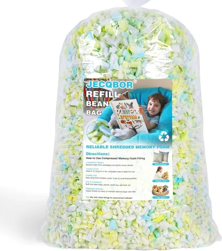 Espuma viscoelástica real y buen valor. El relleno de espuma viscoelástica Jecqbor utiliza espuma viscoelástica de alta calidad certificada de alta calidad. 5 libras de espuma viscoelástica triturada comprimida se pueden expandir hasta aproximadamente 2 pies cúbicos cuando está completamente expandida y esponjada. Puede recuperarse perfectamente y proporcionar un apoyo cómodo y suave. Seguro y saludable. El relleno de la almohada no contiene sustancias sensibilizantes, sin sustancias irritantes volátiles (sin olor), utiliza tintes vegetales (sin productos químicos, sin tóxicos). Utiliza una nueva pieza completa de espuma viscoelástica recortada, por lo que no hay polvo grueso, suciedad o escombros. Cómodo y fácil de expandir. La estructura de las células permeables asegura el respirable e higroscópico requerido por la piel humana. Garantiza la comodidad. Cuando la espuma viscoelástica real se comprime durante mucho tiempo, puede aparecer un rebote lento o pegajosidad, solo espera 1-3 días o separa a mano. Amplia aplicación y buen rebote El recambio de espuma viscoelástica puede recuperarse perfectamente y proporcionar un apoyo cómodo y suave. Ideal para la familia, perfecto para relleno de almohada, cojín, sofá, juguetes de peluche, puf, etc. Fácil de verter y mantener. Si no estás satisfecho, ponte en contacto con nosotros a través de Yaxa, satisfaremos tus necesidades. Simplemente abre la bolsa, vierte el relleno de espuma viscoelástica triturada en un recipiente y deja que se expanda. Cuando la espuma viscoelástica real se comprime durante mucho tiempo, puede aparecer un rebote lento o pegajosidad, solo espera 1-3 días o separa a mano.