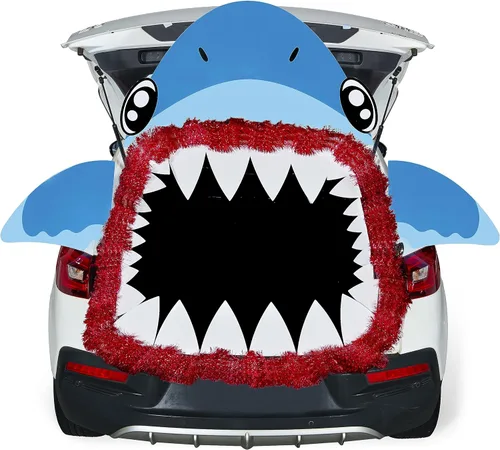 HALLOWEEN - Kit de decoración de maletero o golosinas con diseño de tiburón, decoración de puerta de garaje para casa encantada con un juego de cartones de tiburón, borlas y cintas de doble cara para decoración de Halloween, decoración de garaje, decoración de frente de casa, patio, decoración de vehículos, decoración al aire libre. Paquete de gran valor: este kit tiene 84 piezas, incluyendo 33 cartones, 3 borlas (78.7 pulgadas) y 48 adhesivos sin rastro. El juego de 33 cartones incluye 1 cabeza de tiburón (32 x 17.9 pulgadas), 2 aletas (14 x 13 pulgadas) y 30 dientes (10 grandes, 7.8 pulgadas, 10 medianos, 5.9 pulgadas, 10 pequeños/3.9 pulgadas), lo que te da un juego de tiburón perfecto para decorar tu automóvil. Este es un paquete de gran valor que te ayudará a crear una decoración única de Halloween para tu automóvil. Diseño único: destaca entre la multitud con este baúl o decoración única de Halloween con varios personajes clásicos y lindos de Halloween. Puedes colocarlo en la parte delantera de tu maletero abierto, o en la parte delantera de tu automóvil, o incluso usarlo en interiores para crear un ambiente espeluznante pero divertido. Fácil de usar: nuestro kit de decoración para maletero o automóvil se puede colocar fácilmente en la superficie con calcomanías de doble cara. Se utiliza para fijar decoraciones en paredes u otras decoraciones interiores y exteriores; es adecuado para garajes, puertas, arcos, entradas, pasillos y decoraciones de automóvil. Calidad prémium: nuestras tablas para tronco o golosinas están hechas con látex grueso de alta calidad y materiales de aluminio, que son reutilizables. El kit viene con cinta adhesiva extraíble de doble cara, que no deja residuos ni daños.