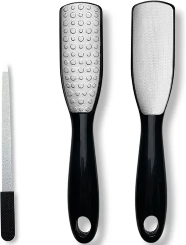 Acabado de zafiro negro élite: el diseño premium ofrece elegancia y comodidad, transformando el cuidado de los pies en una experiencia similar a un spa en casa. Juego de pedicura profesional 2 en 1: incluye una lima de pie de acero inoxidable de doble cara de 9.6 pulgadas (fina + gruesa) y una lima de uñas de zafiro de 6.7 pulgadas (gruesa + extra gruesa) para un cuidado completo de pies y uñas. Grano de doble cara para obtener los máximos resultados: el lado grueso elimina los callos gruesos y la piel dura; el lado fino se dirige a parches secos obstinados, sin dañar la piel sana. Duradero, higiénico y resistente al óxido: hecho de acero inoxidable de calidad; totalmente lavable para uso húmedo o seco, asegurando un rendimiento sanitario duradero. Mango ergonómico antideslizante: diseñado para un agarre seguro, incluso cuando está mojado, proporcionando precisión y control durante cada sesión de pedicura.