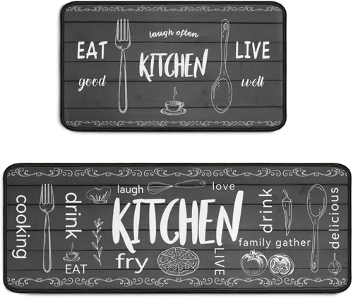 Diseño temático de cocina: tapetes decorativos de cocina de Protikol que incluyen un tapete de 17 x 24 pulgadas y 17 x 48 pulgadas. Estas alfombras de cocina de granja complementan la decoración de tu cocina y hogar. Las imágenes clásicas de cubiertos de "Cocina" (ollas, sartenes y espátulas) se suman al atractivo temático. Elegante pero práctico: esta decoración y accesorio de cocina imprescindible elevará cualquier espacio de cocción Seguro con antideslizante de confianza: alfombras de cocina antideslizantes Protikol con respaldo de goma. Agarran pisos como una ventosa en áreas secas. La superficie de fibra texturizada evita resbalones, mientras que puede absorber el agua rápidamente para mantener el suelo limpio y seco, sin manchas detrás. Alfombras con respaldo de goma, lavables y protegen tus suelos y familia con seguridad de 360°, especialmente en zonas de alto tráfico como cocinas y lavanderías Súper absorbente de agua: disfruta de la comodidad de nuestros tapetes de cocina súper absorbentes para el suelo de 2 piezas. Construidos con microfibra de alta calidad, absorben rápidamente el agua, manteniendo tus suelos limpios y secos. No más lidiar con derrames desordenados; estos tapetes de cocina están diseñados para manejar cualquier contratiempo líquido sin esfuerzo Limpieza y durabilidad sin complicaciones: ¿odias las alfombrillas de fregar? Tira la alfombra de cocina lavable Protikol en tu lavadora. A diferencia de las alfombrillas de PVC de la competencia que se agrietan, nuestra alfombra de cocina tiene fibras resistentes al desgarro y bordes reforzados que resisten los lavados sin decoloración ni rizado. Secar al aire rápidamente, no necesita suavizantes. Perfecto para hogares ocupados con niños y mascotas Aplicable en múltiples escenarios: versátil tapete de cocina Protikol de pie. No sólo para la cocina. Estas alfombras funcionan en cualquier lugar que estés parado: fregadero, estufa, área de preparación, alfombra de lavandería o escritorio de pie. mientras que la construcción duradera mantiene la forma a través del uso diario. Añade comodidad y estilo dondequiera que los coloques
