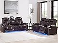 THSUPER Juego de sofás reclinables eléctricos de cuero marrón tipo loveseat con almacenamiento en brazos y reposacabezas eléctrico, juego de sofá