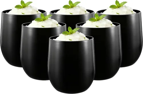 Copas de vino sin tallo de 14 onzas, hechas de 100% acrílico, que es libre de BPA, reciclable y resistente a roturas. Apta para lavavajillas en la rejilla superior, no apto para microondas o para hervir líquidos calientes. Si se lava a mano, no utilice esponjas abrasivas o cepillos.