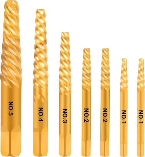 Durabilidad: mejorada con un tratamiento de superficie chapado en oro de titanio para antioxidante. Hecho de material de acero 35#cr-mo resistente a impactos, adecuado para herramientas de corte de metales resistentes a impactos, también puede fabricar rodamientos de alta temperatura y matrices de extrusión en frío. Remoción Fácil - Los extractores de tornillos en espiral con flautas en espiral se incrustan para aumentar el agarre a medida que aumenta la resistencia. El kit extractor de pernos rotos elimina los tornillos dañados, atascados, rotos o apretados, ya sea que trabaje en madera o metal, lo que le ahorra un valioso tiempo y esfuerzo. Varios tamaños: el juego de extractor de pernos EZ Out incluye 5 tamaños de 1#-5/64 pulgadas, 2#-7/64 pulgadas, 3#-5/32 pulgadas, 4#-1/4 pulgadas, 5#-17/64 pulgadas para garantizar que tengas el extractor adecuado para cada situación, también proporcionando necesidades adicionales. Viene con 2 tamaños extra: 1#-5/64", 2#-7/64". Fácil de transportar: nuestro juego de extractores de tornillos hace que el juego sea ideal para reparaciones de automóviles, mejoras del hogar y proyectos de construcción. El juego completo de extractor de tornillos está empaquetado en una caja de plástico para un fácil almacenamiento. Puede proporcionarte una gran comodidad. Nuestro compromiso: nos enorgullecemos de ofrecer un producto de calidad. Perfecto para proyectos de bricolaje y reparaciones en el hogar. Cualquier problema puede ser resuelto. Compra con confianza y agrégalo al carrito ahora