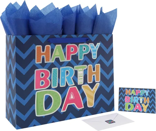 Diseño distintivo: la bolsa de regalo meticulosamente diseñada cuenta con un multicolor "Happy Birthday" que enfatiza prominentemente el tema de celebración. El uso de diferentes colores para el texto simboliza la naturaleza colorida y diversa de los cumpleaños. Además, el borde dorado láser añade un toque exquisito y singularidad a toda la bolsa de regalo. Paquete definitivo: el paquete incluye 1 bolsa de regalo extragrande, 3 hojas de papel de seda azul para envolver o decorar fácilmente, y 1 tarjeta de felicitación del mismo diseño con un sobre que lo acompaña, lo que te permite transmitir tus deseos sinceros. Además, se incluyen 2 calcomanías para mejorar el sentido de la ceremonia en tu experiencia de regalo. Uso versátil: esta bonita bolsa de regalo es perfecta para mejorar el ambiente en fiestas de cumpleaños. Está garantizado para traer alegría a amigos, socios, colegas, niños y padres, por lo que es una opción ideal para celebrar cumpleaños y otros momentos importantes con sus seres queridos. Ya sea una fiesta de cumpleaños para niños o adultos, esta bolsa añade un toque de encanto a tus celebraciones de cumpleaños. Tamaño óptimo: mide 16.5 pulgadas de largo x 5.2 pulgadas de ancho x 12.6 pulgadas de alto, esta resistente bolsa de regalo grande tiene el tamaño perfecto para guardar dispositivos electrónicos, teléfonos inteligentes, tabletas, ropa, zapatos, bolsos, accesorios de diseño y mucho más. Es versátil para regalar varios artículos como chocolates, collares, pulseras, aretes, anillos, libros, suministros de arte, equipos deportivos o utensilios de cocina. Respetuosas con el medio ambiente y de alta calidad: estas bolsas de regalo ecológicas están hechas por expertos con materiales de papel de alta calidad, procedentes de bosques gestionados de manera responsable, asegurando tanto estilo como sostenibilidad.