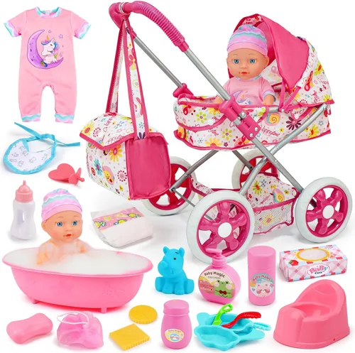 [Juego de cochecito de muñeca de bebé] Nuestro cochecito de bebé incluye un cochecito realista y multifuncional, una delicada muñeca de bebé de 11 pulgadas, una bañera, y viene con 20 accesorios de "cuidado completo" (incluyendo muñecas de animales, plato de cena, un orinal, pañal, suministros de baño, etc.). Desde la tela impresa hasta la variedad de accesorios divertidos, tiene todo lo que tu pequeño podría desear, cada detalle está lleno de encanto infantil, lo que puede proporcionar horas de diversión de juego de simulación. [Aviso: algunos colores y especificaciones de accesorios pueden diferir de los que se muestran en las imágenes.] Cochecito de bebé realista para muñecas: nuestra muñeca de bebé con cochecito simula el diseño de un cochecito de bebé, y se ve y se siente tan real. Cuenta con un toldo plegable, un bolsillo de asiento y una bolsa adicional para las cosas del bebé, por lo que todas las piezas se pueden almacenar fácilmente. El cochecito de juguete está equipado con ruedas de EVA de alta calidad para un paseo suave, incluso lo lleva afuera en superficies exteriores ásperas. Impresionante cochecito de muñeca de bebé para niños pequeños de 1-3, 3-5, cochecito de muñeca para niñas de 4 a 6 6 a 12 años, cochecito de muñeca para 2, 3, 4, 5 años, 2, 3, 4, 5 años, rellenos de cesta de Pascua para niñas Juegos creativos de rol: nuestros accesorios completos y divertidos para muñecas de bebé tienen muchas formas divertidas de jugar: bañar a la muñeca en la bañera, alimentar, cambiar pañales o incluso llevar la muñeca a aventuras en el cochecito. Este juego de accesorios para muñecas de bebé ayuda a desarrollar la coordinación ojo-mano de tu hijo y las habilidades lingüísticas, mientras despierta creatividad e imaginación. Perfecto para niños pequeños que aman fingir el cuidado y contar historias imaginativas. Grandes accesorios para muñecas de bebé para niños pequeños de 1-3, 3-5, muñeca de bebé con accesorios para niñas, muñeca de bebé y accesorios. Alta calidad y seguro: nuestro cochecito de juguete tiene una estructura resistente y no se deshace fácilmente. El babydoll está hecho de material de alta calidad, suave y seguro. Todos los accesorios para muñecas están hechos de plástico de alta calidad sin bordes afilados, lo que garantiza un juego seguro para los niños. El cochecito es fácil de montar, se puede armar en 5 minutos siguiendo las instrucciones (idioma español no garantizado). Maravillosas muñecas de bebé para niñas de 2, 3, 4, 5 años, cochecito de muñeca para niños pequeños de 1-3, 3-5, cochecitos de muñecas para niñas de 6 a 12 años, juguetes de regalo de Pascua para niñas. Regalo ideal para niñas: ya sea que se unan a la rutina de cuidado infantil junto con sus padres o simplemente jueguen a "casa", es perfecto para niñas de 2, 3, 4, 5, 6 años que aman las cosas de muñecas de bebé. Es una gran opción para Navidad, fiesta de cumpleaños o cualquier otra ocasión. Excelente cochecito babydoll para niños pequeños de 1 a 3 años, accesorios babydoll para muñecas, mi primera botella de bañera de muñeca para niñas, juego de guardería de muñecas de bebé, ideas de regalos de cumpleaños para niñas de 2, 3, 4 años, regalos de cumpleaños más populares, regalos para niñas de 2, 3, 4 años, juguetes para niñas de 4 a 5 años. [Servicio de satisfacción al 100%] Si tienes algún problema con el producto que compraste, ponte en contacto con nosotros, te responderemos en 24 horas, listos para ayudarte con cualquier pregunta o problema en cualquier momento.