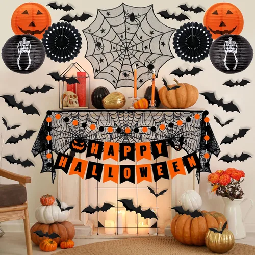 DMIGHT Juego de decoraciones de Halloween para interiores, faroles de papel y abanicos, bufanda de chimenea de chimenea, alfombra de telaraña,