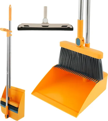 Juego de escoba y recogedor para el hogar, combo de escoba giratoria de 180°, bandejas de polvo plegables, escoba de mango largo y recogedor con