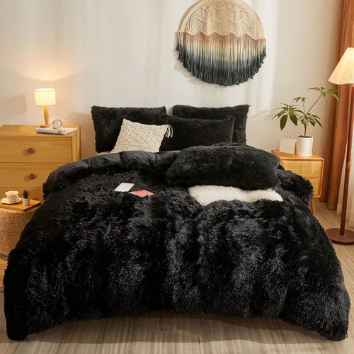 Juego de funda de edredón lanuda de 5 piezas, juego de edredón de piel sintética esponjosa color negro, tamaño Queen, ropa de cama mullida de