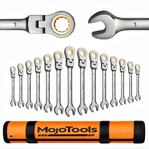 Cobertura completa de tamaño SAE de 1/4 a 1 pulgada. Diseñado por MoJoTools Este juego profesional de llaves de trinquete de 15 piezas de MoJoTools incluye todos los tamaños SAE esenciales: 1/4 pulgadas, 9/32 pulgadas, 5/16 pulgadas, 11/32 pulgadas, 3/8 pulgadas, 7/16 pulgadas, 1/2 pulgadas, 9/16 pulgadas, 5/8 pulgadas, 11/8 pulgadas. 16 pulgadas, 3 /4″, 13/16″, 7/8″, 15/16″, 1″: asegurando una cobertura completa para reparaciones automotrices, maquinaria, mantenimiento de equipos y proyectos domésticos diarios. Cabezal flexible de 180° para un acceso superior en espacios estrechos. Las llaves de trinquete de cabeza flexible MoJoTools permiten hasta 180° de pivotamiento, por lo que es fácil alcanzar pernos en bahías de motor reducidas, áreas de suspensión de vehículos y esquinas estrechas de maquinaria. Trinquete de 72 dientes: más rápido, suave, más eficiente. Con un mecanismo de trinquete de precisión de 72 dientes, cada llave requiere solo un arco oscilante de 5° para una fijación rápida e ininterrumpida. Aumente la productividad y reduzca la fatiga de la mano durante largas sesiones de reparación. Acero Cr-V tratado térmicamente de alta calidad: construido para un rendimiento profesional, MoJoTools utiliza acero al cromo vanadio (Cr-V) para una máxima resistencia, durabilidad y resistencia al par. El acabado pulido anticorrosión ofrece protección a largo plazo incluso en tiendas exigentes o entornos al aire libre. Bolsa organizadora resistente incluida. El juego viene con una bolsa de almacenamiento reforzada MoJoTools con bolsillos claramente etiquetados, manteniendo las llaves organizadas, seguras y fáciles de transportar, ideal para mecánicos, técnicos y usuarios de herramientas en movimiento.