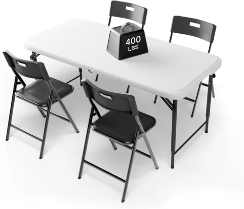 Juego de picnic portátil: mesa plegable de 4 pies y 4 elegantes sillas negras, capacidad de hasta 4 personas. Se pliega para guardarlo en dormitorios, automóviles o espacios reducidos. Construcción resistente: la mesa tiene patas de acero reforzado y soporta 400 libras. Cada silla tiene un marco resistente al óxido con recubrimiento en polvo y soporta 330 libras. Los materiales duraderos permiten que nuestra mesa y sillas resistan condiciones al aire libre, derrames y uso diario. Ajustable y cómodo: la mesa ofrece 3 ajustes de altura (17.7", 23.6", o 29.1"), para todas las edades. Las sillas cuentan con un diseño ergonómico de respaldo que reduce los puntos de presión para sentarse cómodamente durante largos períodos. Fácil almacenamiento y limpieza: la mesa tiene un asa de transporte incorporada, y las sillas se apilan hasta 50 de altura, ambas caben fácilmente en cualquier espacio, como su hogar, garaje o maletero del automóvil. Las superficies de la mesa y el asiento están hechas de polietileno de alta densidad (HDPE), se limpia en segundos para un mantenimiento sin complicaciones. Juego multifuncional: listo para usar nada más sacarlo de la caja, se adapta a escenas interiores y exteriores: asientos adicionales de cocina, trabajo en grupo escolar, reuniones pequeñas de oficina, pícnics de campamento, fiestas en el patio trasero y más de lo esperado. NOTA IMPORTANTE: EL ARTÍCULO SE ENVIA EN MÚLTIPLES CAJAS, QUE PUEDEN LLEGAR POR SEPARADO.