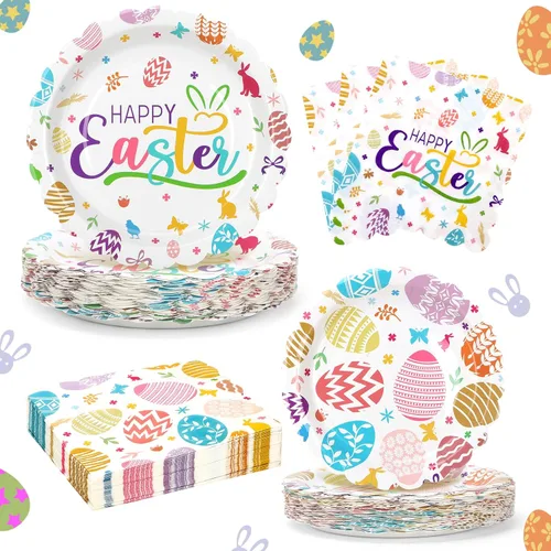 All in One Easter Set: Everything You Need for 50 Guests. This complete Easter party supplies includes 100pcs paper plates in 2 sizes, 50pcs of 9 inch disposable Easter paper plates are for dinner and smaller 7inch plates one for dessert, cake, matching 50pcs of Easter Napkins. No extra shopping—just unbox and set your Easter table in minutes Premium & Sturdy: Holds Up to Your Heartiest Easter Feast! These Easter paper plates and napkins sets are made from thick, food-safe paper, these Easter birthday plates resist bending, leaking, and grease. Quality that delights, from appetizers to dessert Festive Egg design: Brighten Your Table with Joyful Colors! Vibrant Easter egg patterns in cheerful pastels and playful prints create an instant holiday atmosphere. More than just tableware—they’re decorative accents that turn every meal into a celebration Disposable & Stress-free: More Time for Family, Less Cleanup! Celebrate freely without the dish-washing pile! All items are disposable for quick cleanup, so you can relax and savor the moments that matter. Perfect for Easter party, indoor gatherings, garden parties, or picnic celebrations Perfect Easter Party Decorations Set: Elevate any event with these Easter party plates set. It's perfect for Easter birthday party decorations, festive family dinner, spring party, indoor and outdoor holiday events. Wonderland Irish themed Easter favors