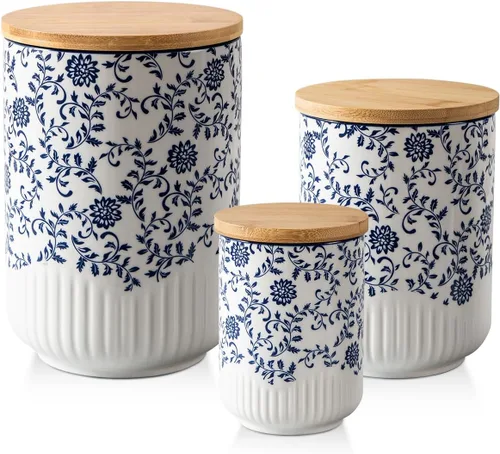 【Conjuntos de botes de cocina】 Este conjunto incluye 3 botes de cocina azules, ofreciendo una variedad de tamaños para satisfacer tus necesidades de almacenamiento. La altura y el diámetro de estos frascos para especias y frascos para azúcar y harina son de 5.6*7.9 pulgadas, 4.6*6.1 pulgadas y 3.65*5 pulgadas respectivamente, tenga en cuenta que debido a las diferentes densidades, la capacidad de almacenamiento sólido puede no alcanzar el máximo. Juego de recipientes de cerámica duraderos: hechos de cerámica resistente, estos recipientes son más duraderos que el plástico o el vidrio, lo que garantiza un uso duradero. Las tapas de madera de bambú, equipadas con anillos de sellado de silicona, proporcionan un sellado hermético para mantener el contenido seco y fresco. 【Fácil de limpiar y usar】 La superficie lisa de los frascos de cerámica los hace muy fáciles de limpiar. Son aptas para lavavajillas para tu comodidad, mientras que las tapas de madera deben lavarse a mano y secarse rápidamente. Para sellar, simplemente gira y presiona la tapa simultáneamente. Esto garantiza que tus tarros de galletas con tapas permanezcan herméticos y que tu almacenamiento de té sea decorativo pero funcional. Versátil y práctico: estos recipientes herméticos para alimentos son altamente versátiles, adecuados para almacenar una amplia gama de productos secos incluyendo aperitivos, harina, galletas, azúcar, sal, pimienta, café en polvo, granos de café, especias, dulces, nueces, avena, frijoles secos y alimentos para mascotas. El diseño de boca ancha permite un fácil acceso y recuperación, convirtiéndolos en una excelente decoración para el mostrador de la cocina y en prácticos contenedores de cocina. 【Regalos navideños pensados】: con una combinación de tamaños pequeños, medianos y grandes, este juego está cuidadosamente diseñado para satisfacer varios requisitos de almacenamiento. Ya sea para Navidad, Día de la Madre, Día de San Valentín, cumpleaños o celebraciones de inauguración de la casa, estos juegos de cocina son regalos prácticos y elegantes para amigos, familiares o colegas. Sirven tanto como contenedores de almacenamiento decorativos como contenedores esenciales de cocina.
