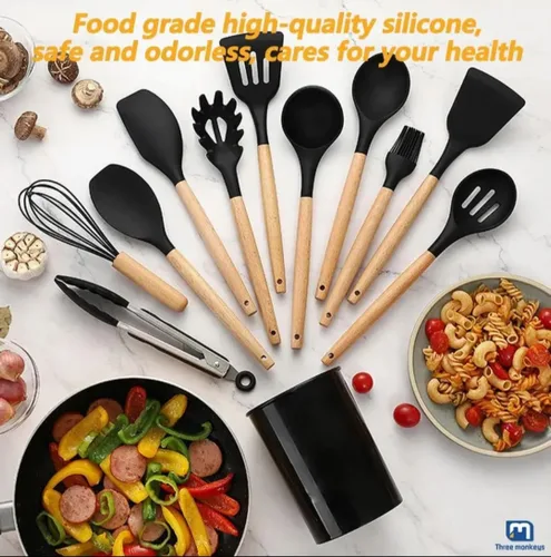 Descripción optimizada del producto Mejora tu cocina con estilo y función Haz que cocinar sea más fácil y agradable con este juego de utensilios de cocina de silicona de 11 piezas. Diseñadas con cabezales de silicona resistentes al calor y asas ergonómicas de madera, estas herramientas combinan un estilo moderno con una durabilidad práctica. Juego de cocina todo en uno Incluye todo lo que necesitas: espátulas, cucharas para servir, servidor de pasta, batidor, pinzas, cepillo para untar y más, además de un soporte para utensilios a juego para mantener tu encimera ordenada y organizada. Seguro para utensilios de cocina antiadherentes La silicona de grado alimenticio sin bisfenol A soporta altas temperaturas sin derretirse ni deformarse, mientras protege tus ollas y sartenes de arañazos. Perfecto para cocinar todos los días y utensilios de cocina antiadherentes. Cómodo y duradero Las asas de madera natural proporcionan un agarre seguro y cómodo y se mantienen frescas mientras cocinas. Cada utensilio está construido para durar, mezclando durabilidad con un diseño atemporal. Perfecto para cualquier cocina. Disponible en negro, verde menta y rojo, este juego complementa cualquier decoración de cocina y es un maravilloso regalo para cocineros caseros y chefs por igual. Desde voltear panqueques hasta servir pasta, estos utensilios están diseñados para