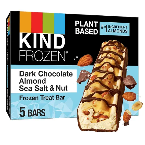 Contiene cinco (5) barras de chocolate negro con almendras y sal marina KIND FROZEN Las almendras son el primer ingrediente de esta barra a base de plantas KIND Las barras FROZEN están hechas con deliciosos ingredientes que te encantan, incluyendo chocolate negro, almendras y sal marina Esta cremosa barra de almendras con chocolate negro tiene 180 calorías, por lo que es un postre sensato o un regalo en cualquier momento Encuentra barras KIND FROZEN en el pasillo del congelador o recibe tu socio favorito de entrega