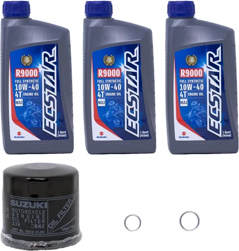 Los paquetes Edwards contienen: 3 cuartos de aceite para motocicleta Suzuki Ecstar R9000 completamente sintético 10W-40 Filtro de aceite Suzuki 16510-07J00 Arandelas de 12 mm y 14 mm Boquilla Edwards, paño de taller y guantes