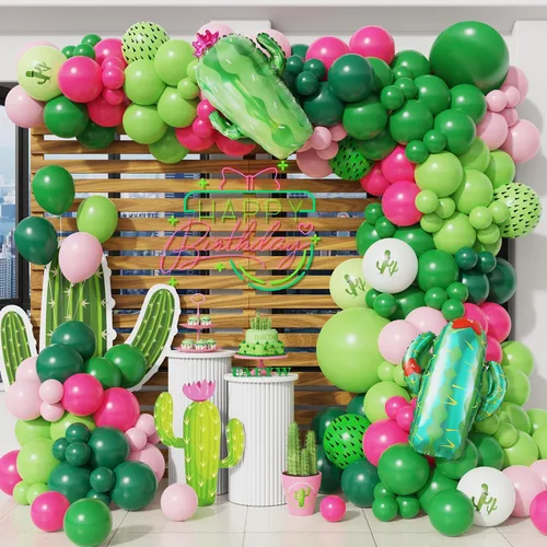 El paquete incluye: 30 globos de color verde oscuro, 31 globos verdes, 31 globos verdes frutales, 20 globos rosas, 20 globos rosa intenso, 8 globos de látex de cactus, 2 globos de papel de aluminio de cactus, 1 cinta de tira de arco de globos, 1 rollo de pegamento de 100 puntos. Material prémium: nuestros globos de fiesta de cumpleaños de cactus están hechos de látex natural, no tóxico. Todos los materiales son de alta calidad y buena seguridad. Ten cuidado de no inflar demasiado los globos, o se reventarán y estallarán fácilmente. Amplias aplicaciones: el kit de arco de globos de cactus es perfecto para fiestas temáticas de cactus, fiestas mexicanas, fiestas hawaianas, fiestas en el desierto, fiesta de cumpleaños de llama, fiesta de verano, fiesta de Cinco de Mayo, fiesta de taco, fiesta de carnaval y varias fiestas festivas. Es ideal para organizar una gran fiesta de cactus y maravillosos accesorios de fondo para sesiones de fotos en interiores o exteriores. Fácil de montar: puedes hacer cualquier estilo que te guste. Ofrecemos las herramientas que pueden ayudarlo a hacer arcos de globos más fácilmente. Inserta el nudo de globo en el agujero de la tira de cadena de globos. Luego utiliza el pegamento de puntos para fijar los globos en su lugar. Será una manualidad divertida para hacerlo tú mismo con tu familia. Solo disfrútalo. GARANTÍA DE SATISFACCIÓN: Si no está satisfecho con nuestros productos, simplemente díganos y le reembolsaremos incondicionalmente en su totalidad. Te recomendamos que puedas comprar dos o más para hacer una mejor guirnalda.