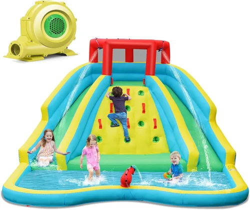 ¿Buscas un regalo divertido y único para tus hijos o nietos? El tobogán acuático inflable de KOTEK seguramente será un éxito. Es perfecto para cumpleaños, vacaciones o cualquier ocasión. Las diversas composiciones que incluyen tobogán, piscina, pared de escalada y pistola de agua permiten a tu pequeño experimentar una variedad de alegrías y activar sus células deportivas. Además, los rociadores de manguera funcionarán todo el tiempo, para que puedan disfrutar de la felicidad del baño. No hay necesidad de ir a la playa llena de gente, tus hijos pueden divertirse en el agua solo en casa. Características: Toboganes dobles, una piscina de chapoteo, una pared de escalada, función de pulverización y cañón de agua para varios entretenimientos Exclusivo material de tela Oxford de alta resistencia para una máxima durabilidad. Las costuras ajustadas protegen la tela de desgarros y rasgaduras. El tubo de agua y el conector de manguera están incluidos para la función de pulverización de agua. Las paredes de malla protectora en la plataforma superior evitan que los niños se caigan. 7 estacas de tierra fijan la gorila al suelo para mejorar la estabilidad y la seguridad. Fácil de desinflar y se puede plegar en un tamaño pequeño para almacenar en la bolsa de transporte. La gran piscina de salpicaduras se puede llenar con agua, bolas oceánicas o arena para uso seco y húmedo. Especificaciones: Color: Amarillo, Verde, Azul, Rojo Material: tela Oxford 840D + 420D. Dimensiones totales: 143.7 in x 179.9 in x 89.8 in (largo x ancho x alto). La profundidad de la piscina: 9''/ 7.9 in Carga de carga: 350.5 lbs (cada niño debe ser inferior a 100 lbs/45 kg) 3-10 años Número máximo de niños: 3-4 Soplador: 735 W (incluido) Peso neto: 52lbs/24 kg El paquete incluye: 1 tobogán acuático inflable. 1 soplador de 735 W. 1 bolsa de transporte. 1 conjunto de manguera. 4 parches de reparación. 7 estacas para el suelo. 1 instrucciones (idioma español no garantizado).