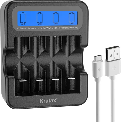 Adecuado para: solo cargador, batería no incluida; solo para baterías recargables AA o AAA de iones de litio de 1.5 V de "voltaje constante", no para baterías de litio Ni-MH u otras baterías de litio de voltaje no constante Cargador de batería inteligente: USB tipo C, entrada 5V-2A, pantalla inteligente es monitorear el progreso de carga en cualquier momento, reconocimiento inteligente del tipo de batería, el tipo incorrecto de batería no se puede cargar, apagado automático después de cargarse completamente, para garantizar la seguridad de la carga y extender eficazmente la vida útil del ciclo de la batería. Carga segura y rápida: CE, RoHS, FCC certificado. El cargador está hecho de material ignífugo de PC/ABS, sin combustión, más seguro y duradero. Dispositivo de protección de circuito integrado, protege completamente la estación del cargador de cortocircuitos, sobrecarga, sobrecalentamiento, polaridad inversa. Carga rápida: Aproximadamente 2.5h-3.5h puede llenar 4pack de baterías de litio recargables Kratax AA o AAA. Cargador con cable USB tipo C, compatible con cualquier cargador o equipo con pieza USB. Ranuras de carga individuales: se puede cargar cualquier cantidad de baterías.