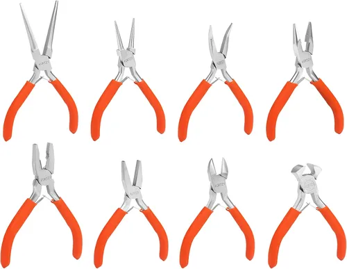 Juego de alicates de 8 piezas: este kit contiene herramientas ideales para principiantes o profesionales. Con asas antideslizantes de goma y resorte, requieren menos esfuerzo y son fáciles de usar. Nuestro juego contiene cortadores de alambre de 4.53 pulgadas de largo, alicates de punta larga de 4.92 pulgadas de largo, alicates de punta redonda de 5.04 pulgadas de largo, alicates de punta de aguja de 5.91 pulgadas de largo, alicates de nariz plana de 4.72 pulgadas de largo, alicates de nariz doblados L11 1.1 in 5 pulgadas), alicates Linesman de 4.9 in de largo (4,88 pulgadas) y cortadores de extremo de 3.9 in de largo (3,94 pulgadas). GRAN ADICIÓN DE KIT DE HERRAMIENTAS: Con este práctico kit puede llevar a cabo cualquier tarea o proyecto desde cortar, doblar, dar forma y agarrar. Algunas cabezas tienen dientes dentados para poder de agarre extra, algunas tienen narices largas y estrechas para mayor precisión y otras tienen cabezas lisas, por lo que no se rayan. Cada alicate está hecho de acero y no se oxida. Esto garantiza resistencia y durabilidad que dure y sería un gran regalo o adición a tu caja de herramientas. Los alicates se envían recubiertos de aceite para garantizar que no se oxiden a la llegada. Mangos ergonómicos de goma: cada alicate pequeño tiene un mango ergonómico redondeado para caber cómodamente en su mano y tiene un agarre de goma naranja suave antideslizante. Esto hace que cada alicate sea cómodo y seguro de usar sin que se deslice de la mano. Se abren automáticamente y tienen un resorte sólido de doble hoja que abre las cabezas, lo que hace que nuestras pinzas sean ideales para personas con artritis. Estos dan una gran precisión y control incluso con los proyectos más delicados. Perfecto para todos los proyectos: recortar, agarrar, envolver, alisar, engarzar y dar forma. Estas pinzas son ideales para el hogar o un taller y se pueden utilizar para diseñar y manualidades, reparación de joyas, joyas de piedras preciosas, abalorios, hacer aretes, pulseras, collares, cordones, alambres, trabajos de componentes electrónicos/eléctricos, reparaciones de relojes y relojes, construcción de PC, fabricación de modelos, construcción de robots, placas de circuitos, soldadura, reparaciones de guitarra, carpintería y quitar clavos, pernos y tornillos. DISEÑADO PARA LA VIDA: Cada producto de nuestra colección está construido con propósito, función de mezcla y estilo. Nuestros diseños cuidadosamente elaborados garantizan una fiabilidad duradera y comodidad cuando sea necesario, ideal para cualquier ocasión.