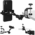 Soporte para iPhone para escritorio/mesa/barra/gabinete de cocina, soporte de teléfono de aleación de aluminio ajustable de 360°, soporte de clip