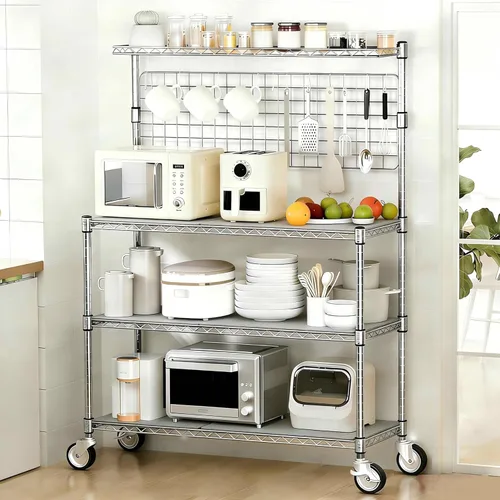 【Estante de cocina certificado por NSF】El estante de panadería de metal Leteuke está certificado por NSF/ANSI Standard 2, de calidad confiable. Como un estante de almacenamiento de cocina de grado comercial de alto estándar, el diseño de malla de alambre transpirable de cada estante lo hace perfecto para almacenar frutas y verduras en un ambiente seco. Y también es seguro para almacenar utensilios de cocina, electrodomésticos, utensilios de cocina, aperitivos y productos de despensa, etc. Estante de almacenamiento de cocina ajustable de 4 niveles: más grande que la mayoría de los modelos convencionales, con 4 estantes de metal (una encimera y 2 estantes inferiores que miden 42 pulgadas de largo x 18 pulgadas de ancho), lo suficientemente ancho como para contener 2 hornos de tamaño común uno al lado del otro, y lo suficientemente alto como para apilar una cafetera y un microondas juntos. Y cada capa es ajustable en incrementos de 1 pulgada, con clips para asegurar. Nota: Los clips de la misma unidad deben fijarse a la misma altura. Con un panel de rejilla colgante y un medio estante, es conveniente almacenar más herramientas. 【Estante de Almacenamiento Rodante Multifuncional】Con una estructura de acero al carbono de alta densidad con revestimiento cromado, los estantes de panadería de pie con ruedas son resistentes y a prueba de óxido, y pueden mantener una apariencia brillante por mucho tiempo. Con 4 ruedas (2 con freno) para un mejor almacenamiento móvil y 4 pies ajustables para una mayor estabilidad cuando se utiliza en terrenos irregulares. Capacidad de peso: Cuando está en las patas de nivelación, puede soportar hasta 930 libras. Y la capacidad total de carga en las ruedas no es inferior a 450 libras. 【Incluye ganchos colgantes y forros para estantes】Incluye 20 ganchos en S de metal (3 cm), cada uno puede soportar 22 libras. Y ofrecemos 1 lámina (4 láminas en total) de revestimiento de estante PP extra para cada capa (pequeña de 1*0,5 mm para media estante + 1*2 mm para encimera + 2*0,5 mm para las dos capas inferiores). Diferente de las placas de madera MDF de otros, nuestra superficie de trabajo está diseñada con un revestimiento de estante de 2 mm de espesor hecho de plástico PP amigable, no se distorsiona fácilmente y es seguro para el contacto directo con alimentos calientes (resistencia al calor de 176-212 °F). Estantes de almacenamiento grandes fáciles de montar: 42 pulgadas de largo x 18 pulgadas de ancho x 63 pulgadas (sin ruedas). El estante rodante de 4 niveles para hornear en la cocina con todas las piezas en el paquete, se puede montar fácilmente sin herramientas. Perfecto para almacenamiento en restaurantes y cocinas, cafeterías, bares, florerías, garajes, almacenes y estudios, etc. Con el diseño de ruedas, también se puede utilizar como un estante móvil de almacenamiento de alimentos para barbacoas al aire libre. 【100% Servicio al Cliente】Leteuke ofrece una garantía de 1 año y se compromete a proporcionar un servicio posventa profesional para cada cliente. Si tienes alguna pregunta sobre el producto, no dudes en ponerte en contacto con nosotros. Le responderemos dentro de las 24 horas. Leteuke te desea una vida feliz.
