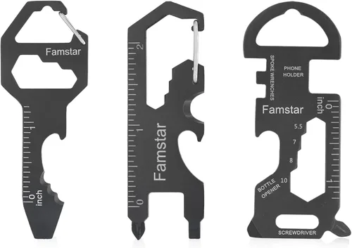 Famstar Llavero multiherramienta, paquete de 3 herramientas de bolsillo de metal, portátil, llave sin óxido para tornillo, regla y abridor de
