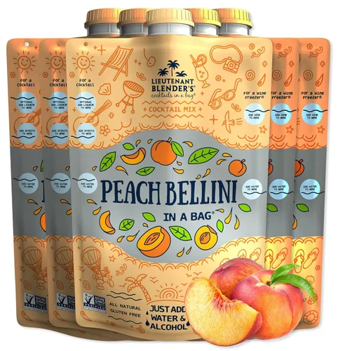 Cócteles Bellini de melocotón fáciles de hacer: ¡Di arrivederci a tu licuadora o máquina de cócteles! Para nuestros Bellini de melocotón en una bolsa, solo tienes que añadir agua, alcohol, agitar, congelar y apretar. No necesita licuadora. Obtén un delicioso cóctel granizado cada vez. Solo los mejores ingredientes: nuestra batidora de cóctel bellini está hecha solo con los mejores ingredientes: melocotón real y azúcar de caña. Nuestra mezcla no contiene OMG y no contiene conservantes ni colorantes ni sabores artificiales. Es el mejor granizado de mezcla de bellini de melocotón y melocotón que jamás probarás, ¡de hecho galardonado! Perfecto para entretener, fiestas en estacionamiento, camping, la playa, caravana o simplemente relajarse: nuestro Peach Bellini in a Bag es tu nuevo mejor amigo. resellable y portátil, es el mezclador de cóctel perfecto para entretener en casa o sobre la marcha. Deja atrás las botellas de vidrio y la licuadora, te tenemos cubierto. ¡Tamaño de fiesta! : Nuestro mezclador de cócteles Bellini congelado ofrece 16 porciones por bolsa, ¡eso es un montón de cócteles! Perfecto para esas fiestas de verano o barbacoas familiares. ¿Solo quieres una porción? Simplemente vuelve a colocar la tapa y meterla en el congelador para más tarde. ¿Vas libre de alcohol? : No hay problema, solo use agua o un jugo de uva blanca en lugar del alcohol con nuestra batidora de bebidas. ¡No hay razón por la que aún no puedas disfrutar de un sabroso bellini de melocotón sin alcohol!