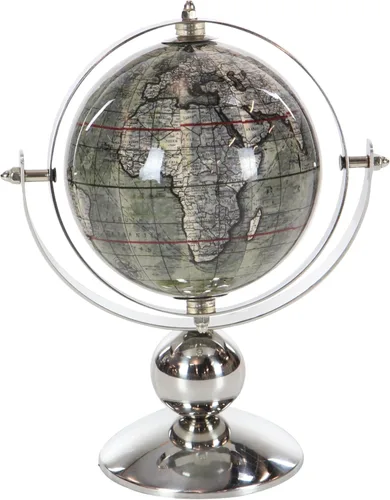 Globo mundial tradicional: diseñado con sofisticación atemporal, ricas texturas del viejo mundo y tonos cálidos se unen para un refinado sabor clásico de lujo Decoración de globo de metal de acero inoxidable: el globo de tierra educativo/geográfico plateado está hecho de acero inoxidable y plástico, lo que garantiza una estructura robusta y duradera Globo de plata y azul en un soporte: el globo del mundo redondo muestra un globo teñido gris con tonos de continentes blancos y grises, marcas rojas y negras, complementado con un marco y base de plata pulida Globo decorativo redondo para sala de estar: el globo de acero inoxidable muestra bordes detallados, etiquetas y líneas de latitud y longitud para una experiencia educativa Globo decorativo de tamaño pequeño para oficina: el globo de metal de acero inoxidable plateado mide 7.50L x 5W x 9H pulgadas, y pesa 0.80 libras