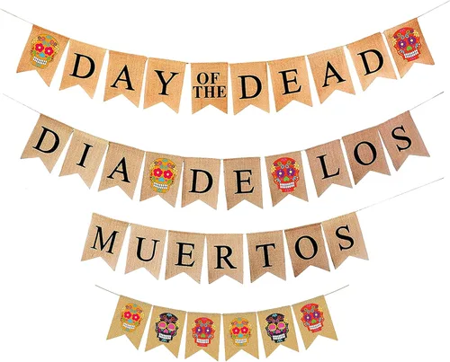 Guirnalda de decoración del día de los muertos mexicano hecha de arpillera de yute natural; banderas mexicanas duraderas e inodoras del Día de los Muertos; decoración mexicana hecha a mano del día de los muertos; pre-encordada y no necesita ensamblaje; apta tanto para uso en interiores como en exteriores Guirnalda del Día de los Muertos con calavera de azúcar en una cuerda extra larga y banderines individuales se deslizan a lo largo de la cuerda; pancarta del Día de los Muertos para mantos, ofrendas, porches, techos, puertas de jardín, balcones, altar, vallas, árboles, ventanas y paredes Decoraciones del Día de los Muertos para el hogar, aula y oficina; telón de fondo del Día de los Muertos para accesorios de cabina de fotos; decoraciones rústicas del Día de los Muertos para fiestas, cumpleaños, bodas y Halloween Letrero del día de los muertos compatible con otras decoraciones del hogar; la guirnalda del Día de los Muertos se puede dibujar con plantillas, marcadores y pintura acrílica, o adornarse con cinta, vinilo, calcomanías y fotografías Pancartas del Día de los Muertos con 10 banderas de banderín con letras grandes pintadas y letrero de calavera de azúcar; tamaño del banderín: 7 x 5 pulgadas; longitud: 8.5 pies